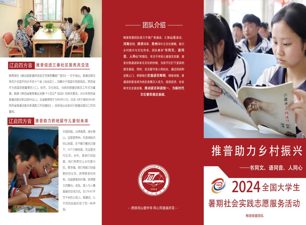 启程仪式前,团队成员们经过深入讨论,最终确定以“贵陕河山爱中华,同心同语遍开花”为本次活动的口号,寓意深远,鼓舞人心。他们还精心制作了“以红色为底,让青春飞扬”为主旋律的宣传册,进一步激发了团队的活力和热情。随后,团队指导教师奚汇特别强调了此次活动的目标和意义,希望通过团队的共同努力,能够缩小地区间的语言差异,为乡村振兴贡献力量,共同迎接一个语言和谐、文化繁荣的新时代。