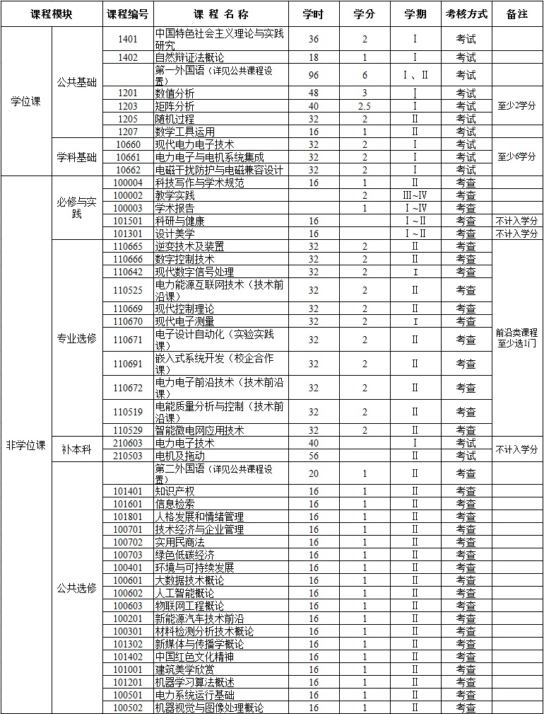 电力电子与电力传动专业硕士研究生研究方向及课程设置(非全日制)